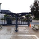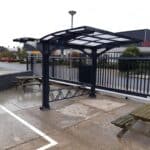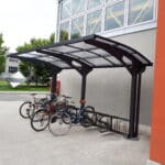 Kestävä polykarbonaattikatto ja tukeva teräsrunko pitävät pyörät turvassa sateelta, lumelta ja UV-säteilyltä. Taakse sijoitettu sadevesikouru ohjaa veden tehokkaasti pois, mikä lisää käyttömukavuutta ja pidentää rakenteen käyttöikää.